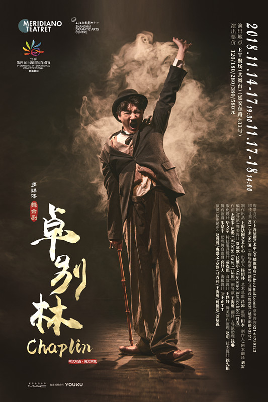 由上海话剧艺术中心制作出品,丹麦梅里迪亚诺(Meridiano)剧团艺术总监贾寇默•拉维尔(Giacomo Ravicchio)担任编剧/导演/舞美设计,上海话剧艺术中心演员赵胜胜、庞盛之、章静、马青利、王海鹰、周挺超、刘炫锐联合主演的多媒体舞台剧《卓别林》将于2018年11月14日至18日,作为“第四届上海国际喜剧节”的剧目之一上演于上海ET聚场。