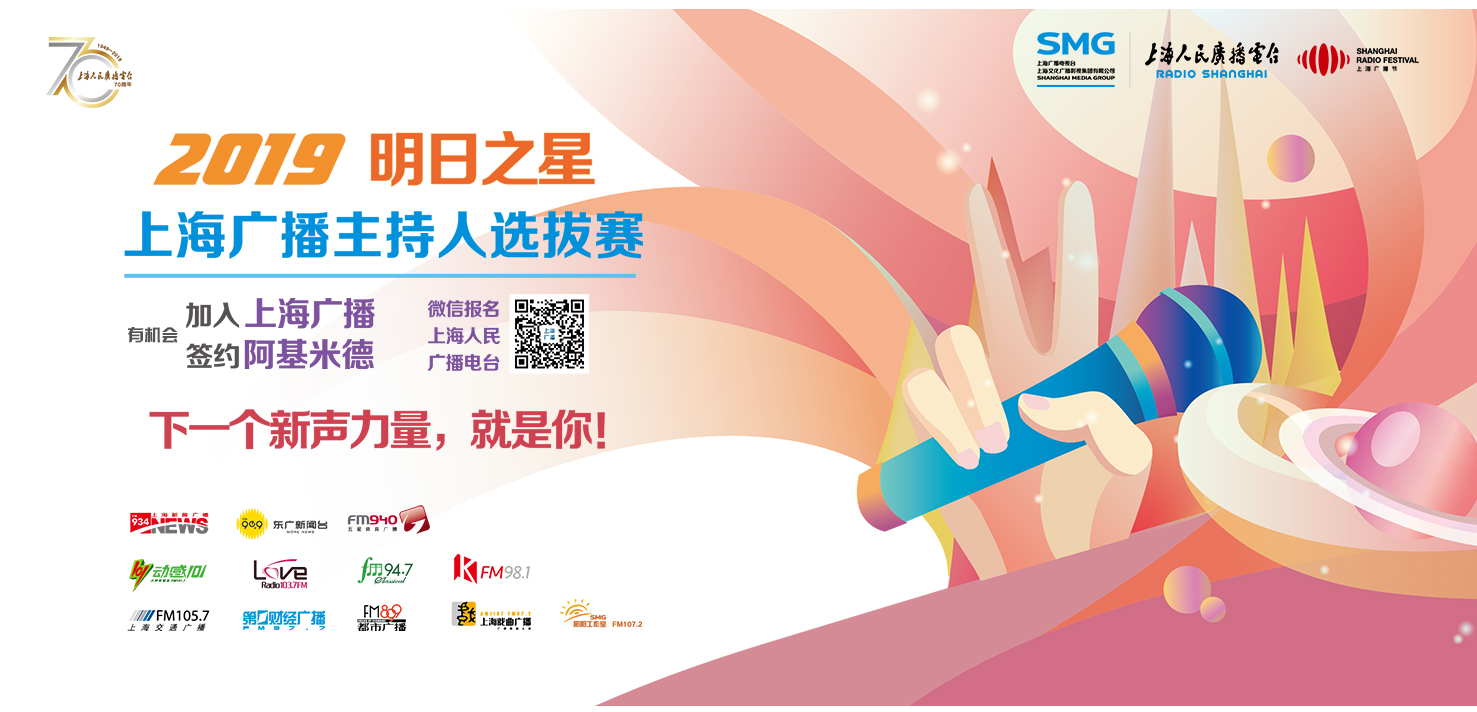 3月18日,2019“明日之星”上海广播主持人选拔赛报名启动,“上海人民广播电台”微信公众号的官方报名通道正式开启。这项上海广播的品牌赛事时隔一年再度回归,将着力发掘具有创新力、专业力和发展力的新时代音乐广播主持人。作为上海人民广播电台70周年暨2019上海广播节的系列活动之一,大赛决赛将于5月22日举行,优胜选手将有机会加入上海广播或成为阿基米德签约主播。