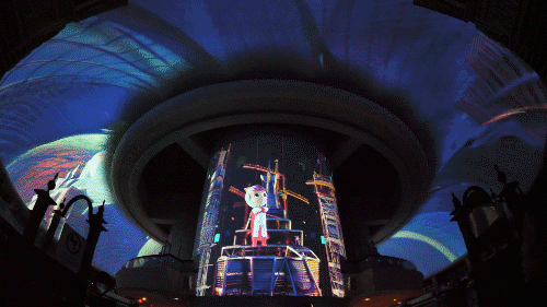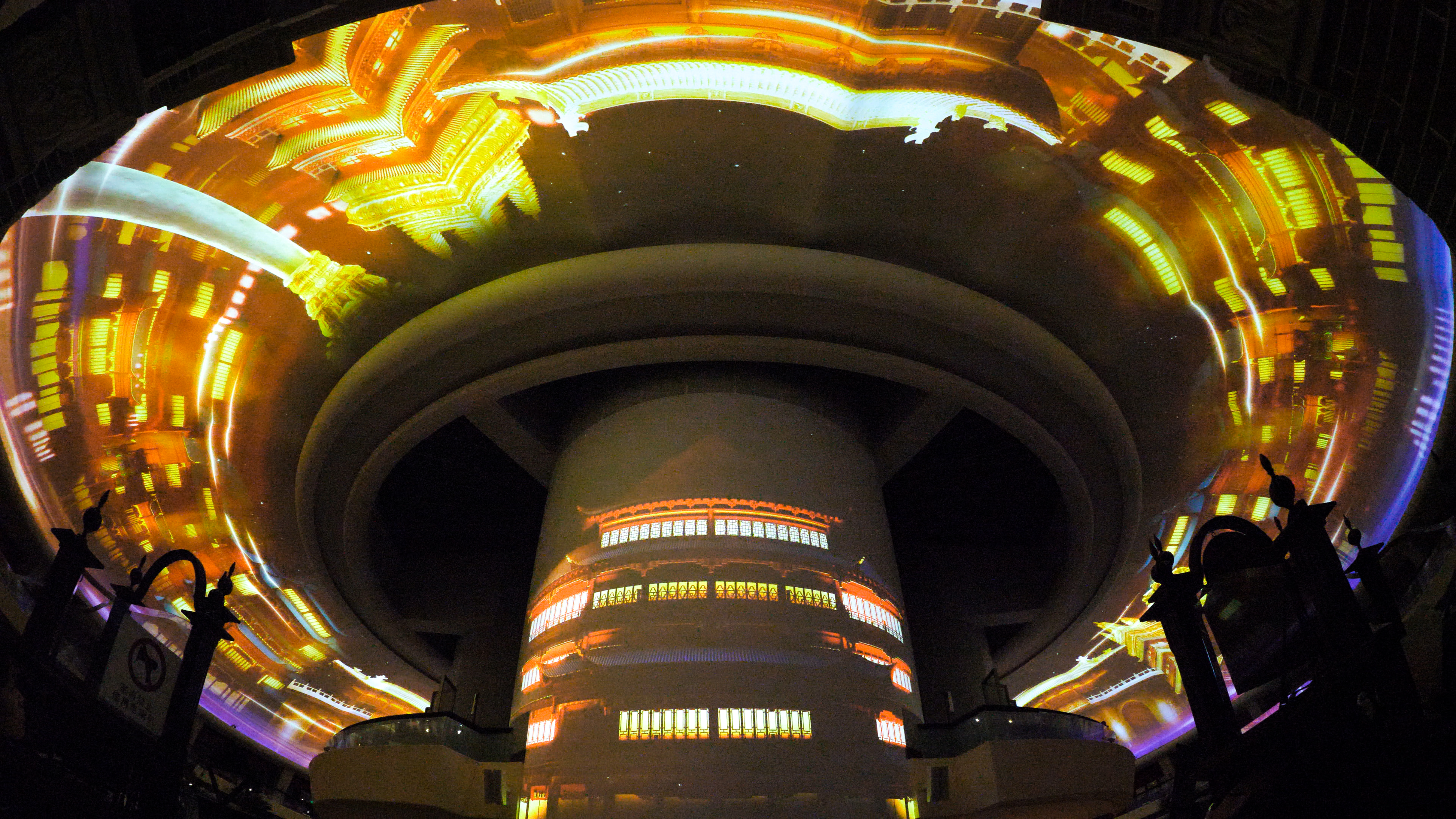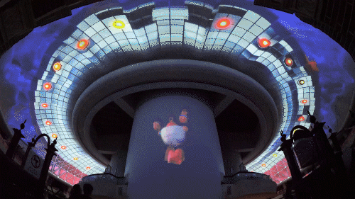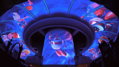 零米大厅巨大的环形穹顶内壁上含有棱纹,整个投影空间为双层结构。为打造这场极具创造性与临场感的穹顶投影秀,制作团队通过30台超高清大流明投影机,以及定制化集成的多媒体服务器系统,用以呈现这场总投射面积达2200㎡的高科技华丽秀演。投射区域以三根圆柱体为界,将立面影像与穹顶影像做联动,结合空间构造,在画面制作中融入视错觉元素的同时,克服画幅巨大,投射空间复杂,影像易变形等技术难点,完美演绎了五个可爱的IP形象的四重绚丽梦境,上演了一场穿越时空、城市历险等多种惊险刺激、神奇浪漫的视觉之旅。在开放式的360°观影环境中,将体验者的听觉、视觉全方位地调动起来。观众在不同的观影位置,将获得不一样的观感体验,还有机会参与演出互动,感受东方明珠IP元年大秀带来的无尽欢乐。