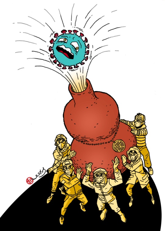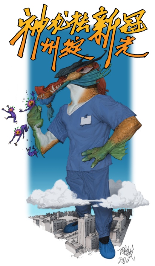 来自马来西亚的华裔画师Lefty、陈永发也心系中国神州大地,特创作了作品《悬壶济世灭新冠》《神龙祛新冠,神州绽新光》,鼓舞共同努力抗疫的人们。前者通过《后汉书•方术列传•费长房》的典故,赞颂医者救死扶伤的高尚品德,后者则通过大气、震撼的笔触和画风,使身处疫情中的人们深受鼓舞。