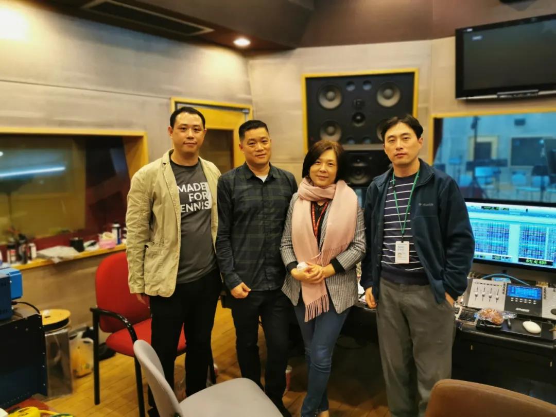 从左至右,音乐编辑罗文、指挥方勇、艺术指导齐放、录音师莫家伟