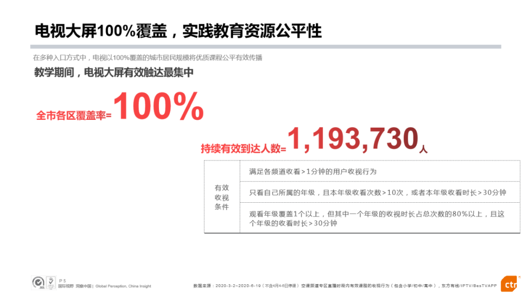 为确保疫情防控期间“停课不停学”,自今年3月2日起,上海143.5万中小学生通过“大屏为主、网络为辅”的形式进行在线学习,实现了“全日制、全覆盖、全媒体、全免费”的在线教育目标。数据显示,通过东方明珠旗下播出平台观看课程的学子超过九成。3月2日至6月19日空中课堂授课期间,东方明珠各播出终端播放总次数超过8200万次,播放总用户数超过196万户,播放总时长超过1亿3千万小时。