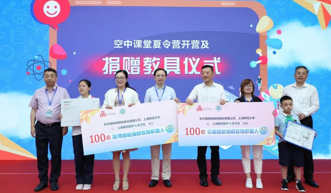 上海师范大学校长朱自强、上海市教育委员会副主任贾炜、上海市文化和旅游局副局长罗毅、东方明珠高级副总裁徐辉作为空中课堂夏令营主办方代表,向上海援鄂医护人员子女捐赠夏令营STEAM课程专业教具。