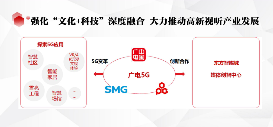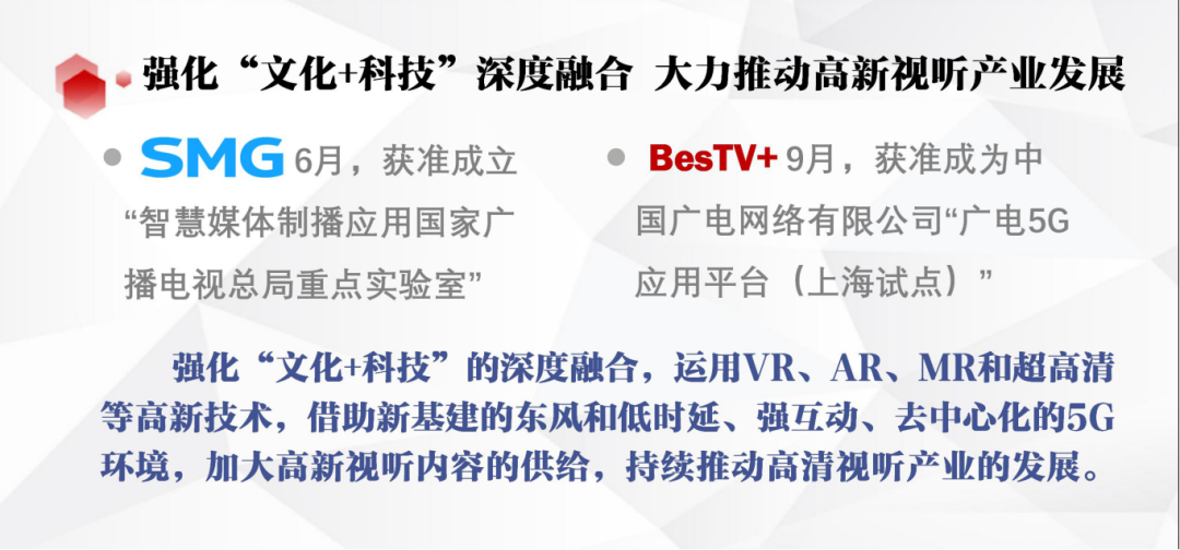 2019年6月,SMG获准成立“智慧媒体制播应用国家广播电视总局重点实验室”;2020年9月,我们的BesTV+流媒体平台获准成为中国广电网络有限公司“广电5G应用平台(上海试点)”。我们希望通过打造新一代的流媒体视频平台,强化“文化+科技”的深度融合,运用VR、AR、MR和超高清等高新技术,借助新基建的东风和低时延、强互动、去中心化的5G环境,加大高新视听内容的供给,持续探索互动视频、超高清视频等高概念、高规格、高质量的高新大屏视听内容的制播,不断刺激和提升消费者对高新视频产品的需求,从而推动高新视听产业的持续发展。