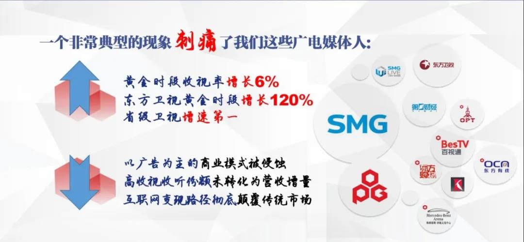 我相信,这也是当前多数传统媒体在转型过程中遭遇的痛点。我个人有个观点,传统媒体遭遇的发展困境中,因产业发展逻辑变化所带来的商业变现的痛点远比内容生产的痛点要强烈。重新审视广电媒体融合发展的产业逻辑,寻求基于广电高新视听产业优势基础的不同于平面媒体转型之路的广电融合发展产业新路,是SMG落实中央精神,继续领跑全国广电的破局使命。