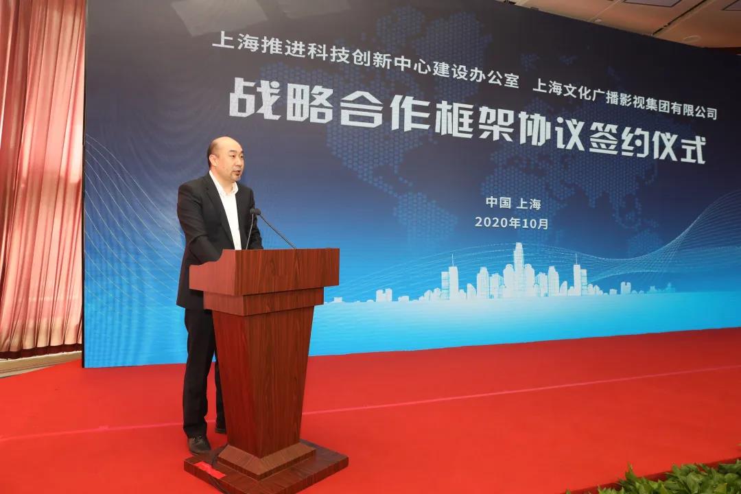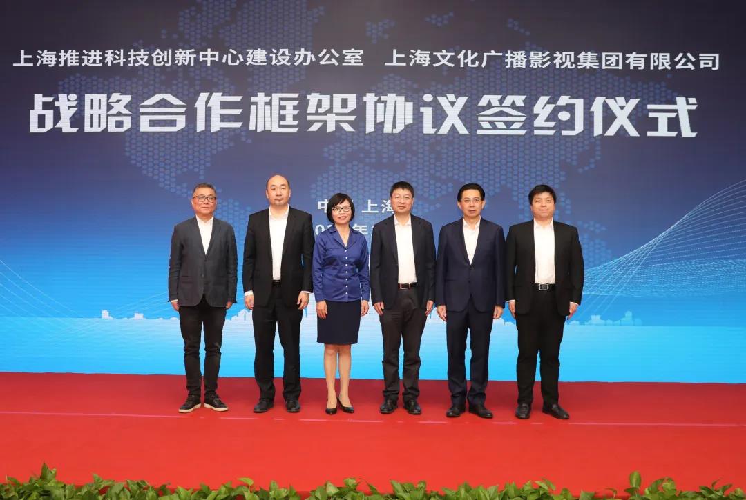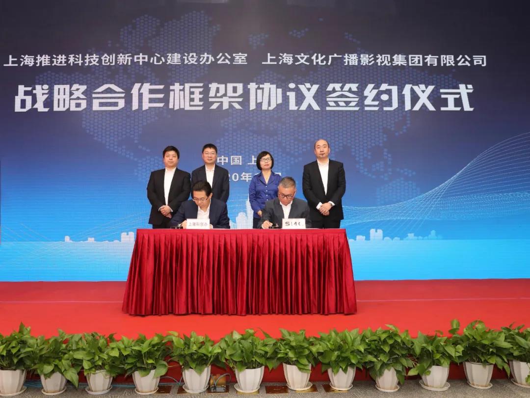 签约仪式上,在上海科创办执行副主任、张江高新区管委会常务副主任彭崧,上海广播电视台、上海文化广播影视集团有限公司党委书记、董事长王建军,上海广播电视台台长、上海文化广播影视集团有限公司总裁宋炯明,上海科创办专职副主任、张江高新区管委会副主任王鼐的共同见证下,上海科创办专职副主任、张江高新区管委会副主任侯劲与SMG副总裁陈雨人代表双方签署战略合作框架协议。