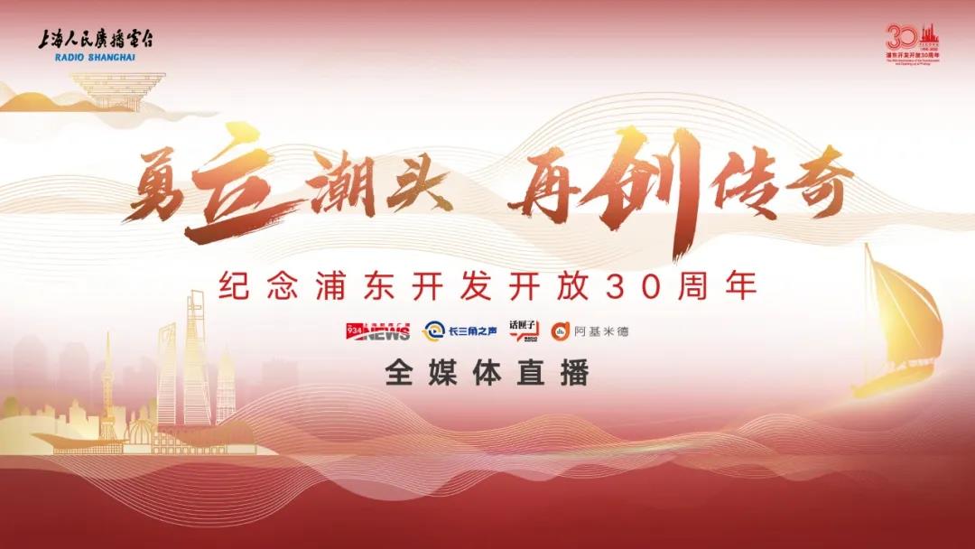 上海新闻广播、长三角之声9:00-12:00推出《勇立潮头,再创传奇》全媒体特别直播。节目以“浦东的声音档案”为主线索,通过浦东开发开放30年中难忘的音响实况串联,嘉宾访谈,记者连线,全景呈现而立浦东奋楫扬帆再争先的精神。节目在上海自贸试验区临港新片区设立分演播室,还首次启用全息影像投影技术,邀请浦东开发开放的亲历者、建设者,展开一场穿越时空的对话。直播在话匣子FM、阿基米德、BesTV 、看看新闻客户端等平台进行音视频全媒体呈现。