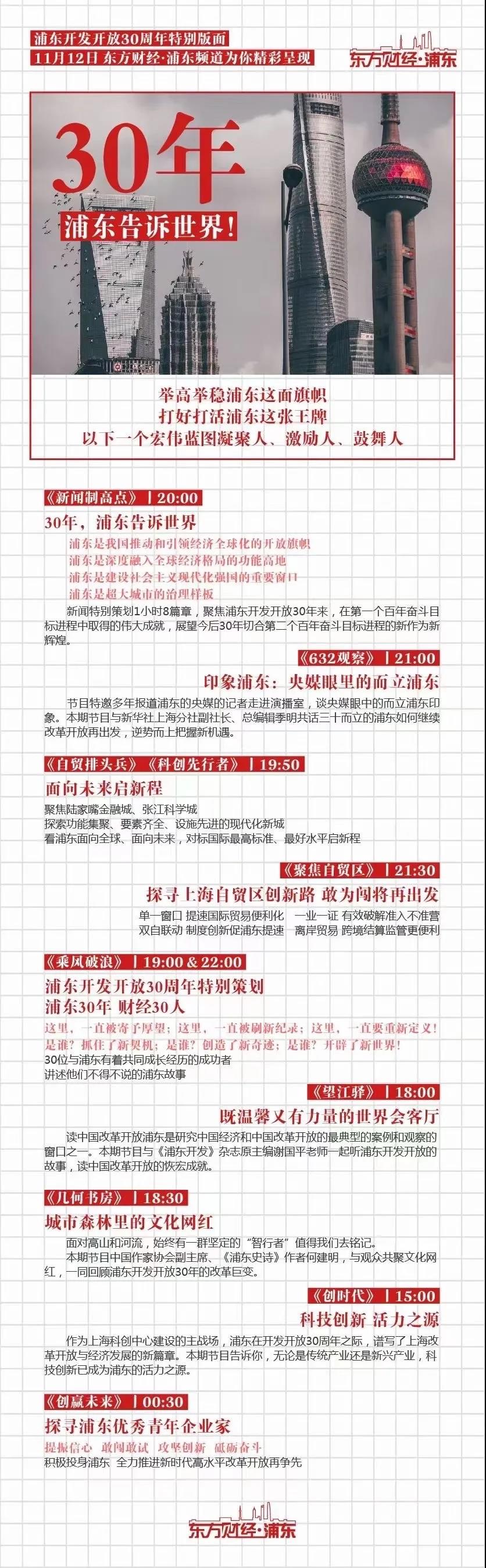 两集纪录片不仅回顾了浦东开发开放波澜壮阔的历史画卷,更集中体现了浦东开发开放勇当标杆、敢为闯将的精气神,时代主题、国家战略、上海责任贯穿其中,对新时代改革开放再出发,具有特殊的意义。纪录片于11月12日12:30东方卫视首播、22:00重播,11月12-13日21:00纪实人文频道播出。