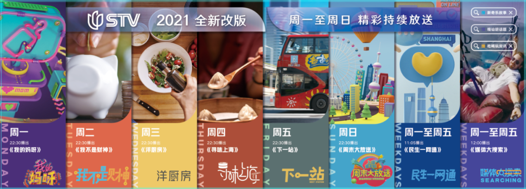 频道周一至周五22:30-23:00重点打造“都市新生活”节目带,推出6档全新的节目。从亲子关系、财富管理、美食文化,到治愈系文旅慢综艺,“这里是上海”,透过节目让我们聆听感受上海这座城市的脉搏跳动。