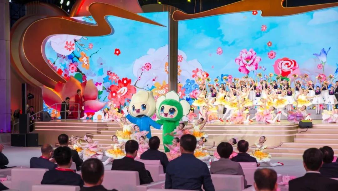 开场歌舞《花开的声音》由小朋友们携手本届花博会开幕式吉祥物圆圆、梦梦一同带来清澈的童声合唱,活泼动感、吉祥欢乐。