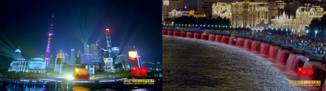 以红色为主色调,以《外滩漫步》和《不忘初心》为背景音乐 ,两岸建筑光影、激光和光束灯、光耀系统等变化逐步加快加彩,烘托气氛提升,配合大屏的标语和烟花效果营造最后一分钟左右的光影秀高潮时刻。