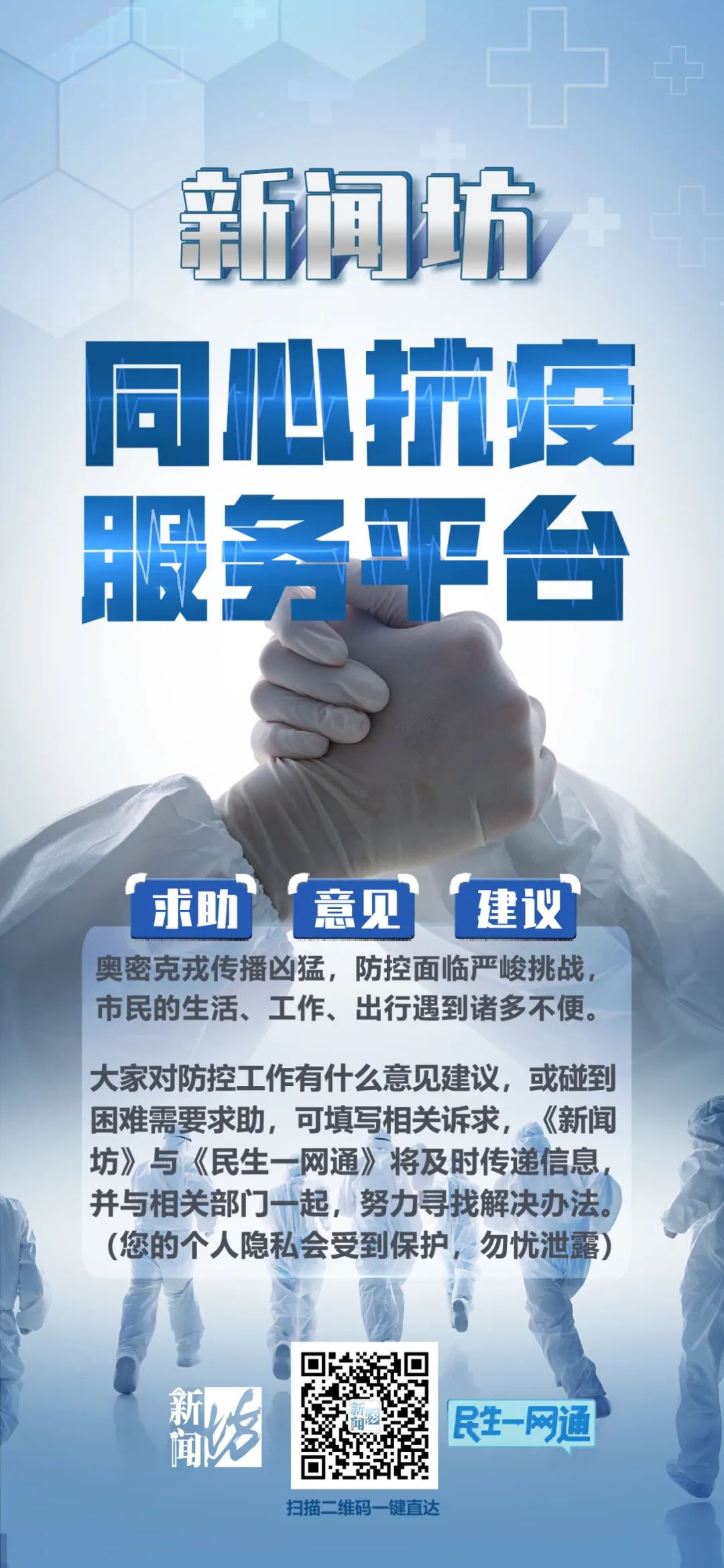 昨日,由融媒体中心打造的“新闻坊同心抗疫服务平台”上线投入使用。在抗疫的特殊时期,市民有任何关于生活、工作、出行等方面的求助、意见、建议,都可以通过“新闻坊同心抗疫服务平台”与栏目组取得联系。在收集相关诉求后,《民生一网通》《新闻坊》节目的记者们将及时传递信息,并与相关部门一起帮助市民寻找解决办法。同时,用户的个人隐私将全程受到保护,市民朋友可以放心使用。