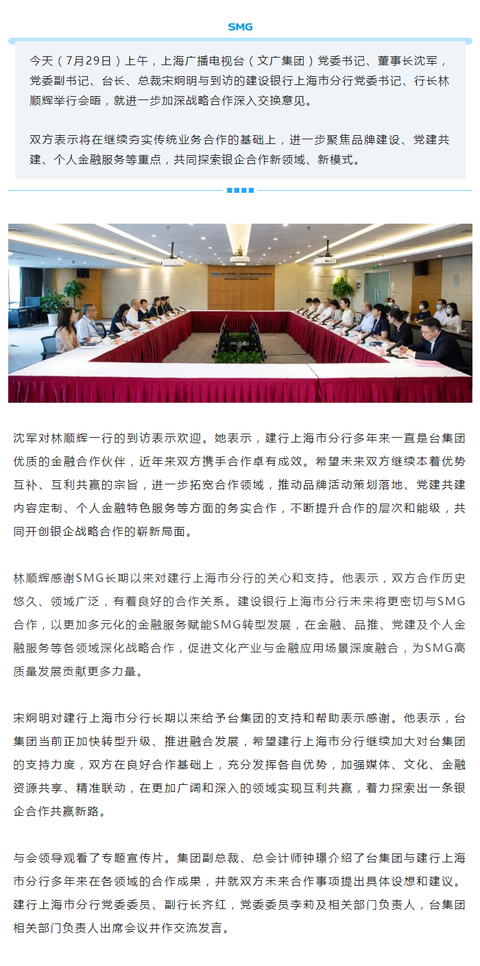 上海广播电视台(文广集团)与建设银行上海市分行共商银企战略合作新模式