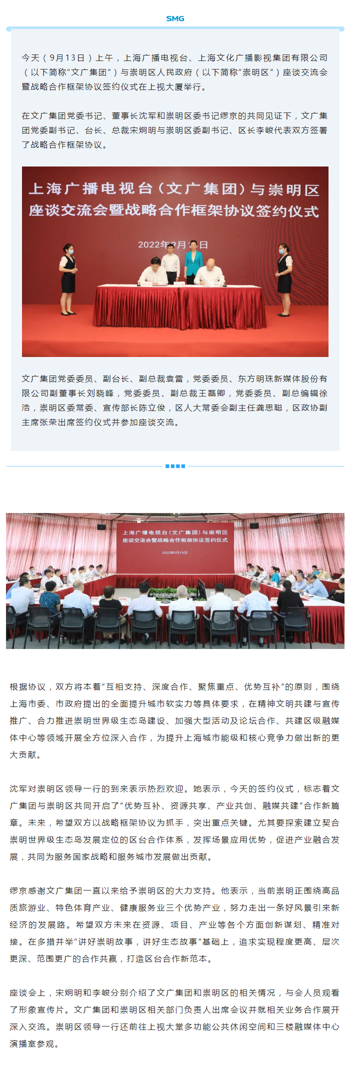 上海广播电视台、上海文广集团与崇明区签署战略合作框架协议
