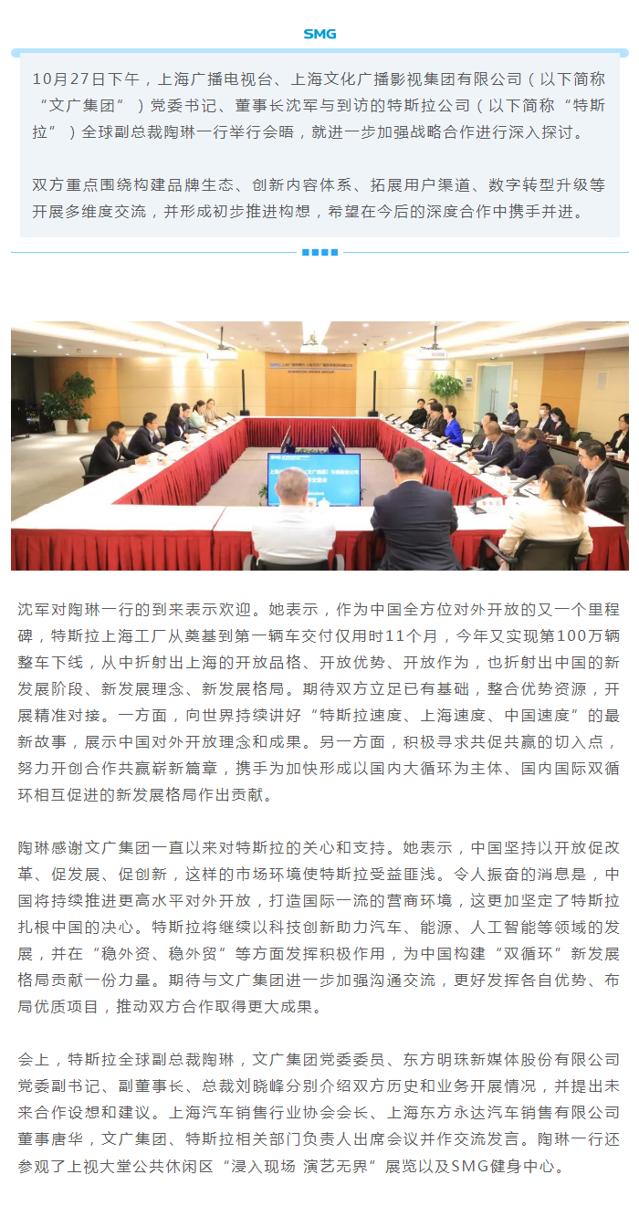 上海广播电视台、上海文广集团与特斯拉公司共探合作新理念