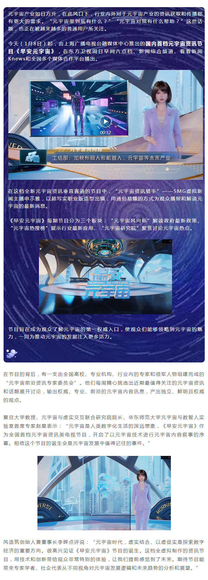上海广播电视台1月8日开播元宇宙资讯节目《早安元宇宙》