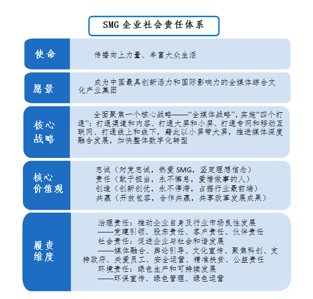 SMG坚持正确导向,以党的领导为核心,忠实履行举旗帜、聚民心、育新人、兴文化、展形象的使命任务,建立起完整的社会责任体系,健全由组织、规划、沟通、执行、传播、考核等组成的社会责任管理制度,全面考量利益相关方需求,建立信息反馈机制,将社会责任履行情况进行全面梳理、及时披露。