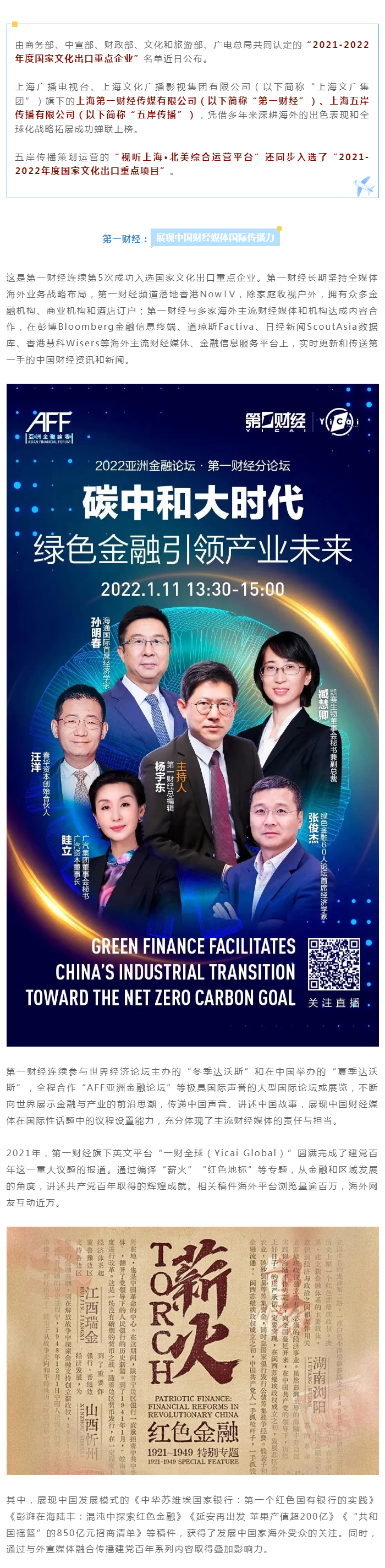 上海文广集团旗下第一财经、五岸传播入选国家文化出口重点企业