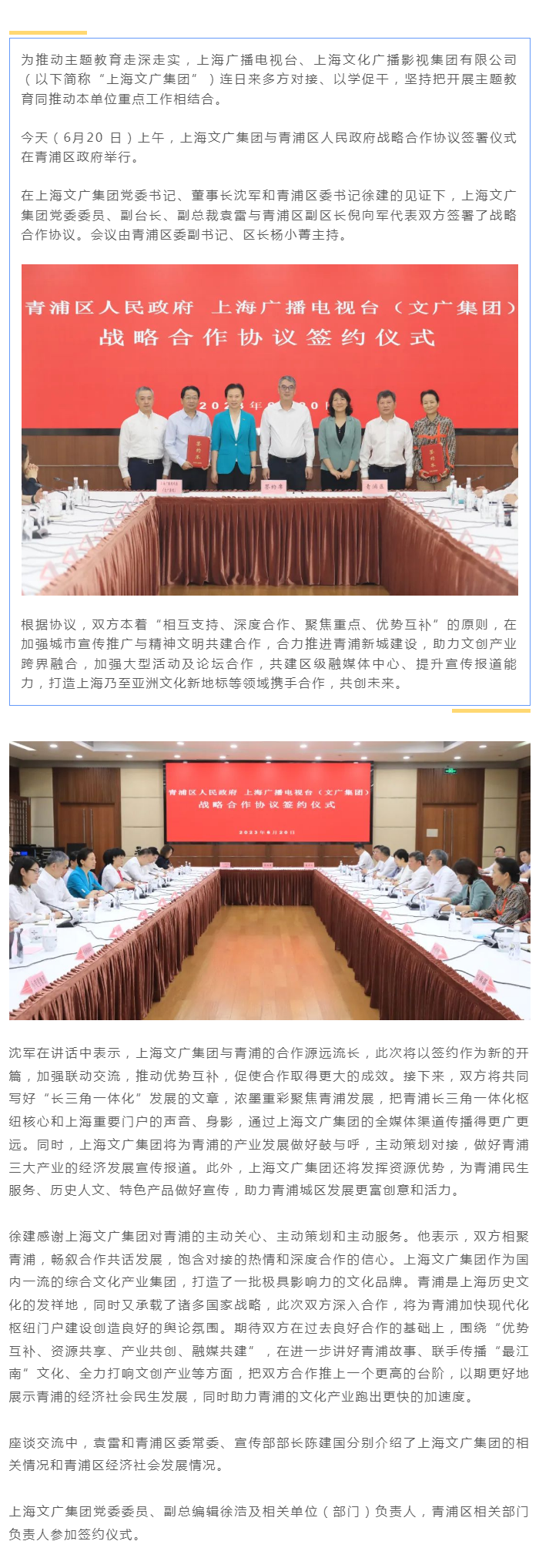 多方对接以学促干,上海文广集团与青浦区签署战略合作协议