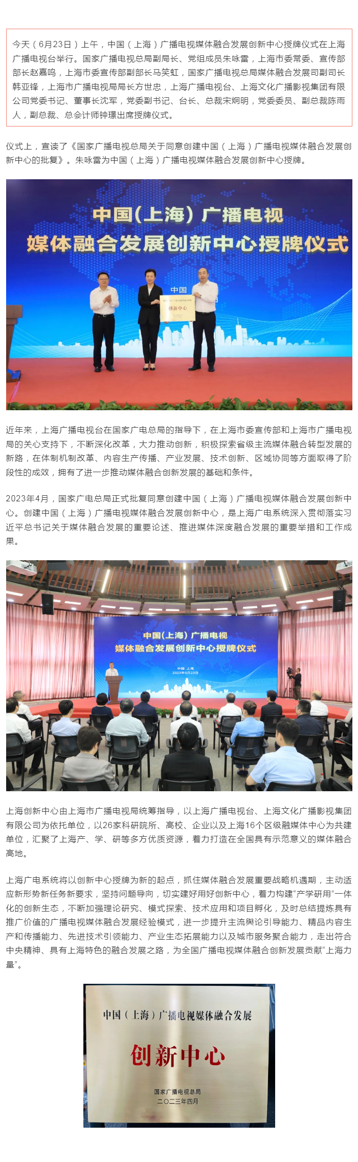 国家广电总局为中国(上海)广播电视媒体融合发展创新中心授牌