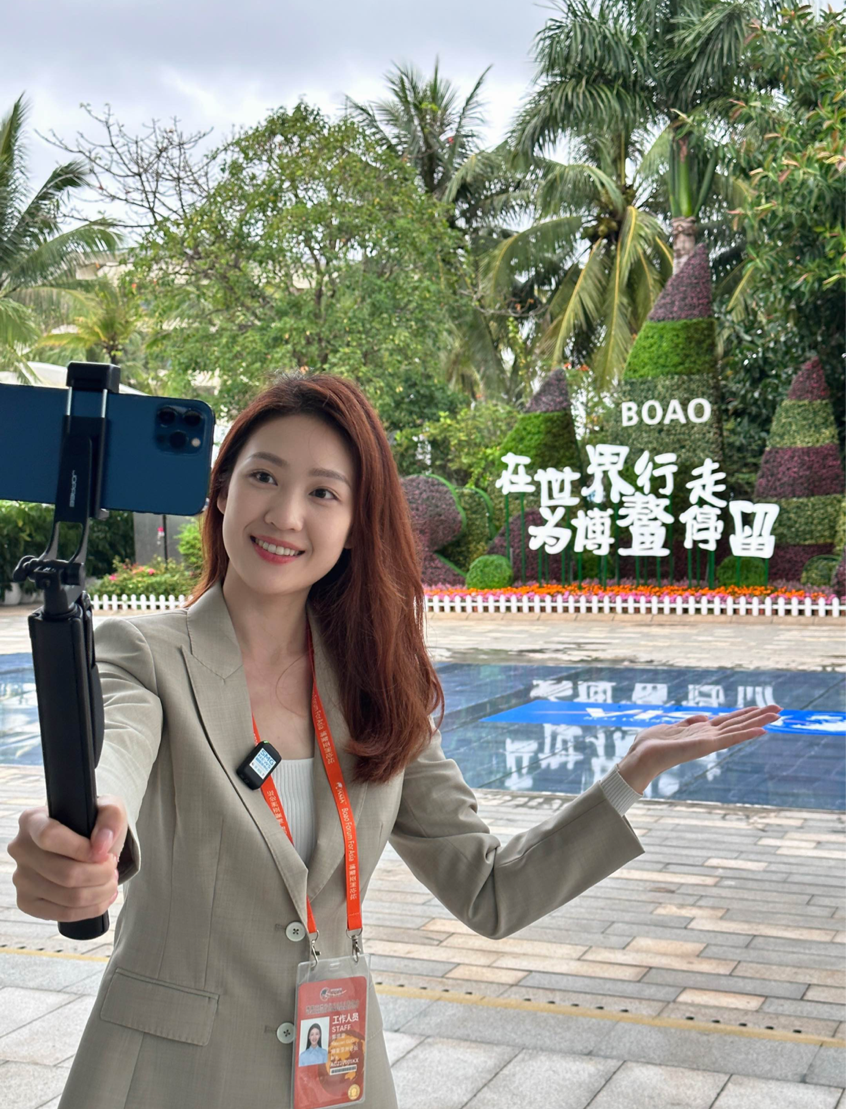 2023博鳌亚洲论坛期间,她作为秘书处新闻官,在对接媒体和会务主持等常规工作之余,见缝插针地找嘉宾、做采访,自编自采发回四期全媒体报道《博鳌“旋”风》,让重磅对话吹来清新小风。