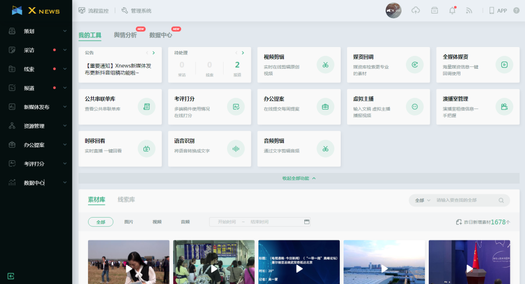 由SMT研发,该项目搭载多种智能应用,具有语音听写、语音转写、自动唱词、语音合成、错字检测、人脸识别、自动技审等AI能力,为各种视频、图片、文字等媒体素材提供自动化生产智能服务。同时,创新开发“在线剪辑”“云连线”“云导播”等融媒体制作工具。