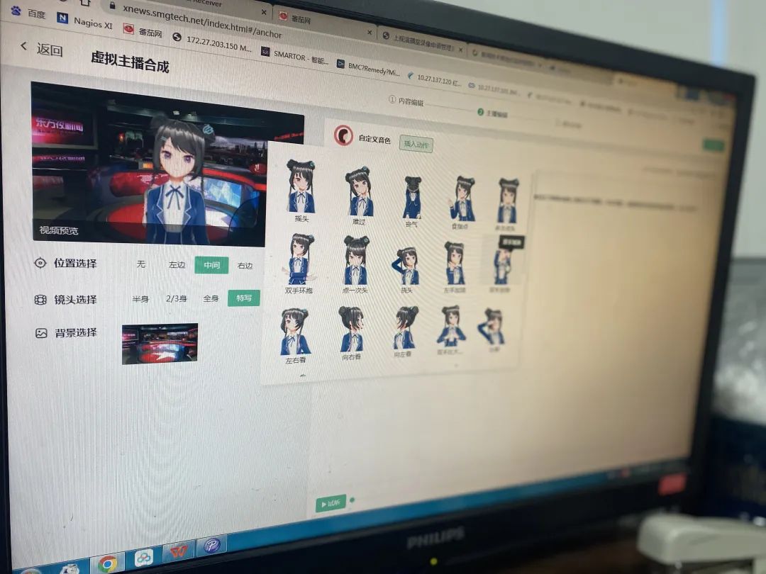 由SMT研发,该项目基于语音合成技术和虚幻引擎动画渲染技术,开创性采用文字中可视化添加动作脚本标记语言的编辑方式,实现在新闻播报应用场景下的虚拟主播自动合成能力。系统提供仿真语音自动合成和自定义配音上传两种播报方式。