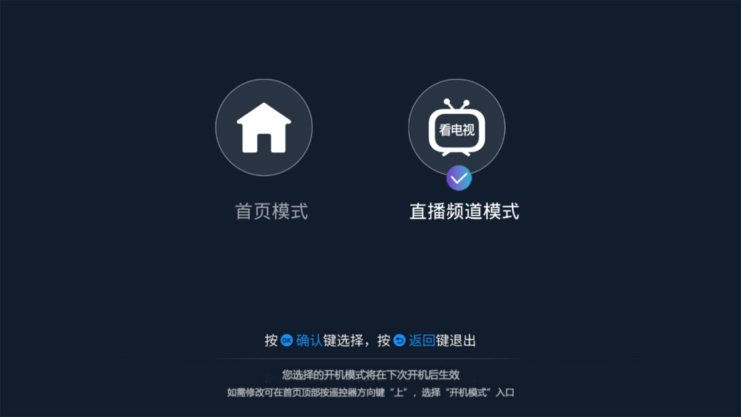 更新后的系统为不同需求的用户提供贴心选项,既可以为家中老人设置默认开机直接全屏看直播,也可以设置默认进入交互主页,选择自己想要收看的节目内容。只需简单几步就可自主选择下一次的默认开机模式: