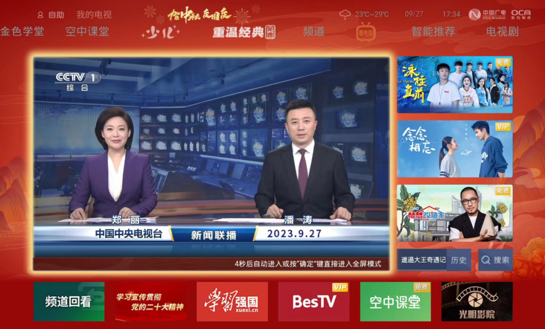 同时,东方明珠新媒体持续为用户提供丰富优质的免费收视内容。东方有线于9月推出了“重温经典”免费点播专区,用户可通过交互主页点击“重温经典”进入收视。百视通免费专区涵盖影视、综艺、少儿、纪实、电竞全部免费内容,以及当周限免热播内容,免费专区入口安排在交互主页直播框下方,一键即达。此外,设置单片付费专区入口,将热门版权付费内容统一专区运营,展示更加清晰,单片付费的观看有效期均延长为7天。