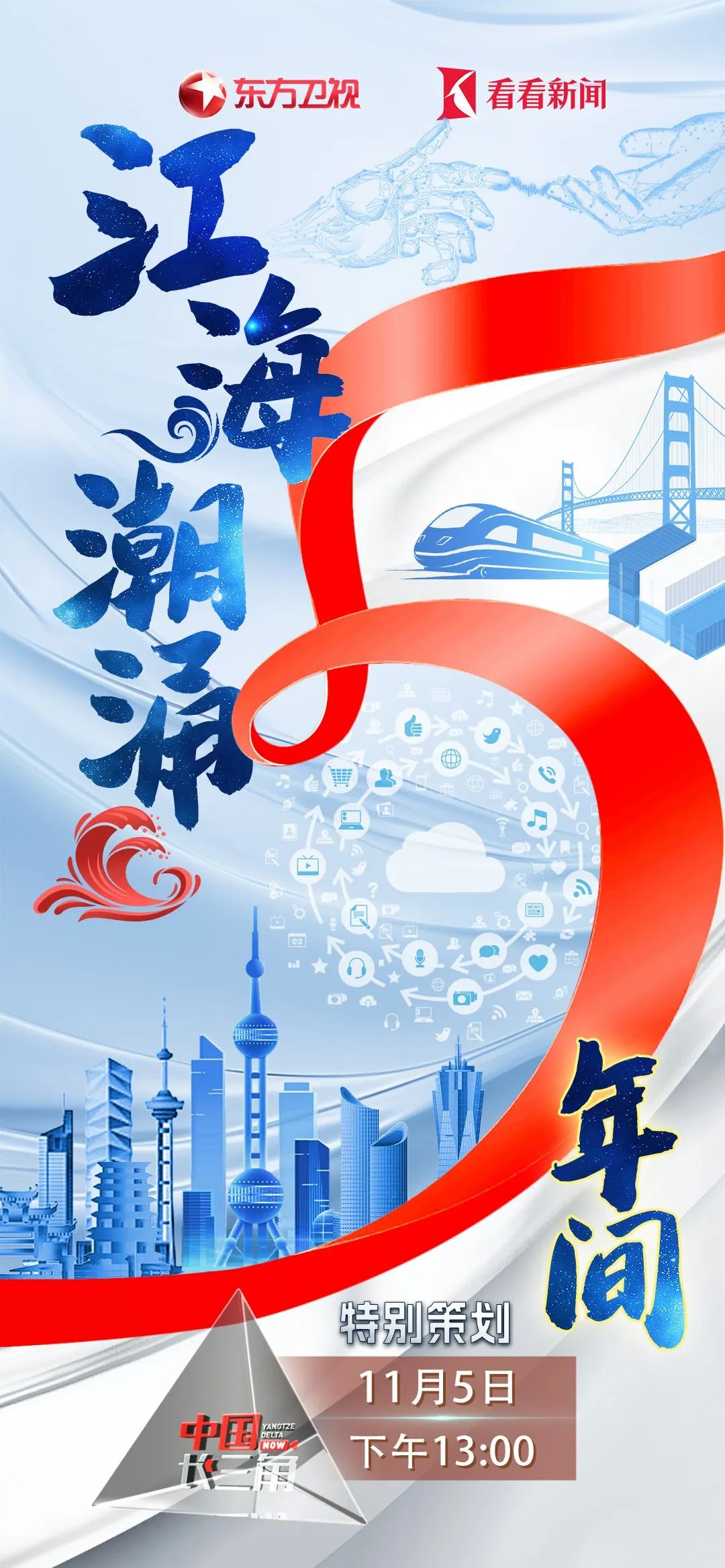 11月5日五周年当天,《中国长三角》栏目将推出《江海潮涌五年间》特别版面,以“政”“通”“人”“合”四个关键词做串联,通过大屏全景展现一体化五年来的成就。节目中还将穿插多路连线,既有互联互通、区域协调的最新动态,也有长三角人的真实感受,同时还邀请到了一体化决策咨询专家、一体化发展研究等3位专家就新起点上长三角一体化如何实现更高质量发展展开深入讨论。