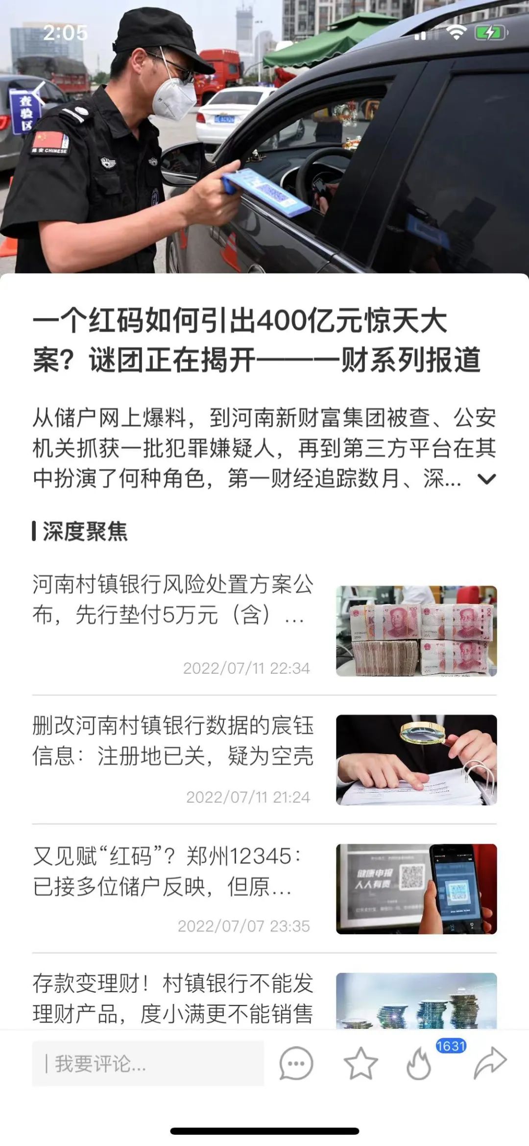 2022年6月14日,第一财经在主流媒体中率先独家报道“河南部分村镇银行储户被赋‘红码’”的消息,并进行追踪报道,对这一事件背后的实控者情况进行深度调查,形成一组时效和深度上处处领先的系列报道。整组报道全网传播总阅读量超过800万、总分享量超过150万、总评论量超过50万;多篇报道单篇全网流量超过100万;首报“红码”事件的独家报道阅读量为10万+;多篇报道成为微博热搜第一。