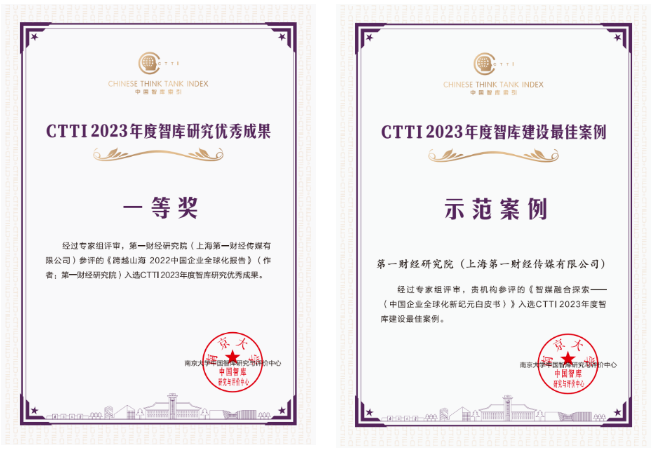 经CTTI专家组评审,第一财经研究院参评的《跨越山海│2022中国企业全球化报告》入选“CTTI 2023年度智库研究优秀成果”,在500多份参评作品中获得一等奖;《智媒融合探索——〈中国企业全球化新纪元白皮书〉》入选“CTTI 2023年度智库建设最佳案例”奖,被评为“示范案例”。这也是第一财经研究院被评为上海市首批重点智库与入选中国智库索引名录以来首次获得该机构发布的奖项。
