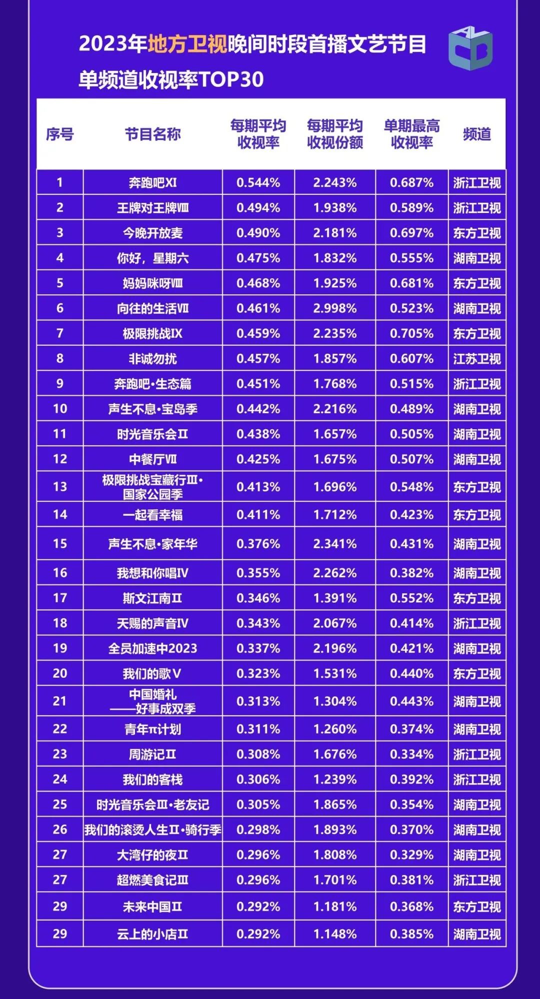 根据CVB年报数据显示,在省级卫视首播文艺节目收视排行中,东方卫视占8席,《今晚开放麦》《妈妈咪呀Ⅷ》《极限挑战Ⅸ》3档节目进入年度收视前10位。