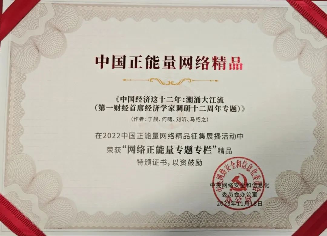 近期,由中央网信办主办的“2022中国正能量网络精品”名单揭晓。经过初选、专家审核评议、网络展播投票、终选以及结果公示,由上海市网信办报送、第一财经传媒有限公司、第一财经研究院主创推出的《中国经济这十二年:潮涌大江流(第一财经首席经济学家调研十二周年专题)》获得“网络正能量专题专栏”精品荣誉。