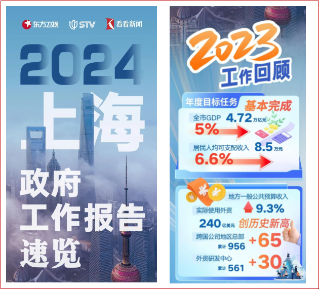 国际传播方面,以“ShanghaiEye魔都眼”为核心发布平台,聚焦政府工作报告,推出2024 SHANGHAI TARGETS图文和视频。