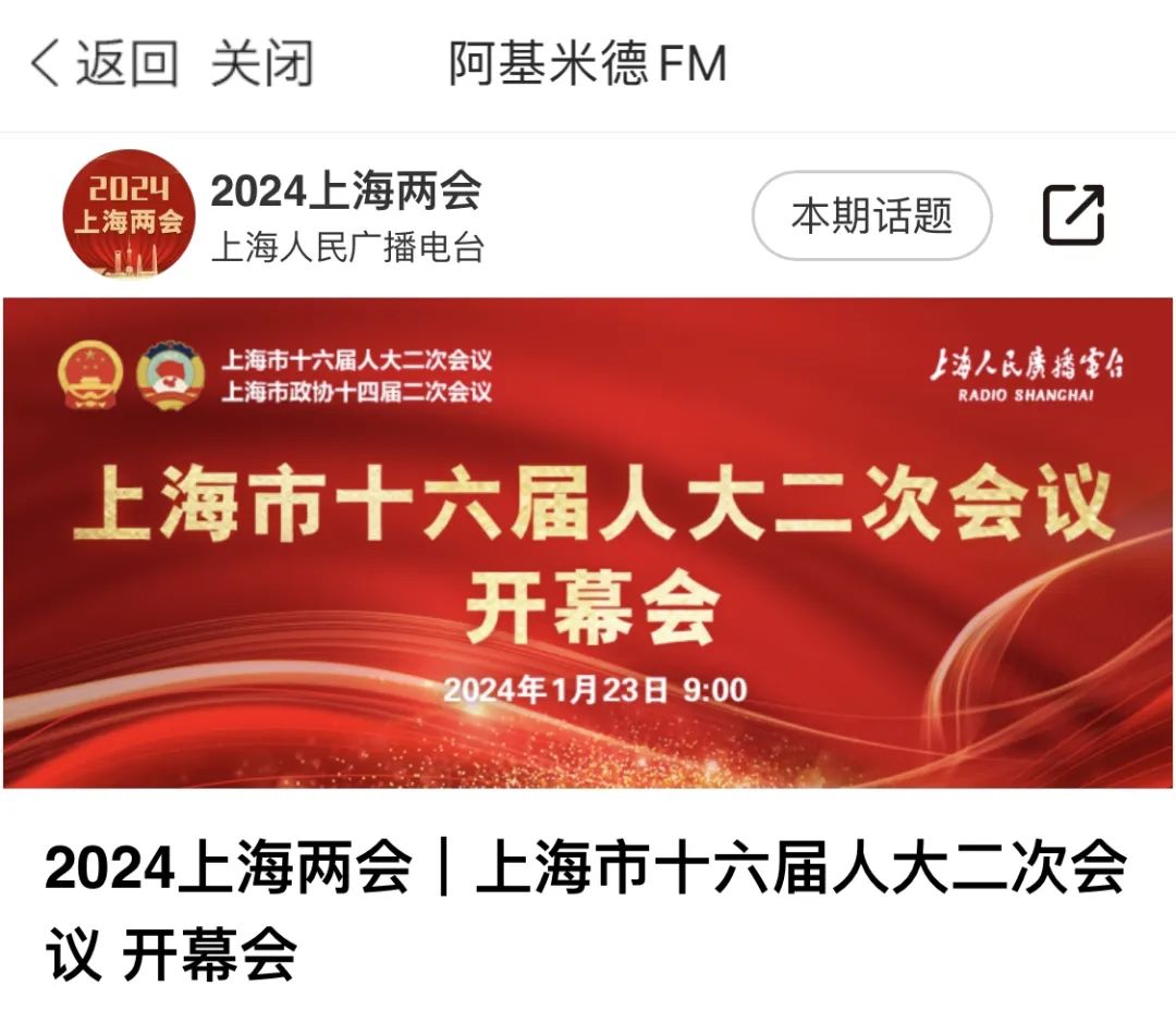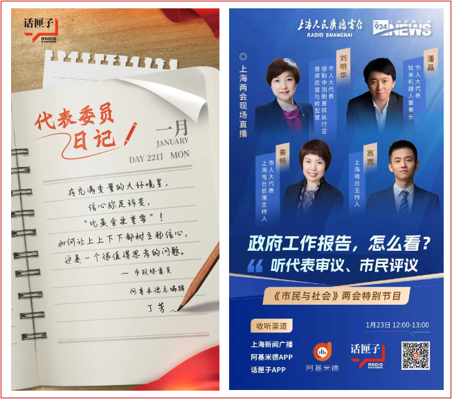 上海两会期间,上海新闻广播全力做好政协开幕会、人大开幕会、人大全体会议、政协专题会议等两会重要议程转播,播出市长记者招待会实况剪辑,长三角之声转播人大专题审议,阿基米德、话匣子矩阵推出音视频、图文直播。
