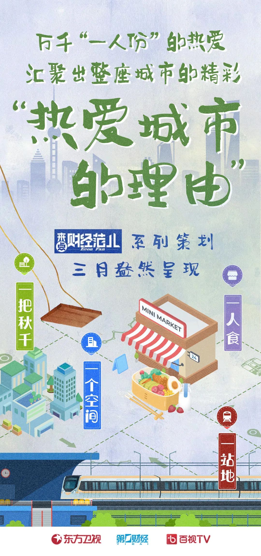 由第一财经制作、东方卫视播出的《来点财经范儿》栏目,于三月全国两会召开之际推出“热爱城市的理由”特别策划。该系列以“一人份”热爱为情绪线索,通过“一人食”“一站地”“一把秋千”“一个空间”的意象,将便利店、地铁、口袋公园和创意园区四个城市年轻人日常接触的载体连接起来,在城市经济学为主的逻辑背景下,广邀年轻人与不同领域的专家就青年发展型城市的话题进行同场分享。