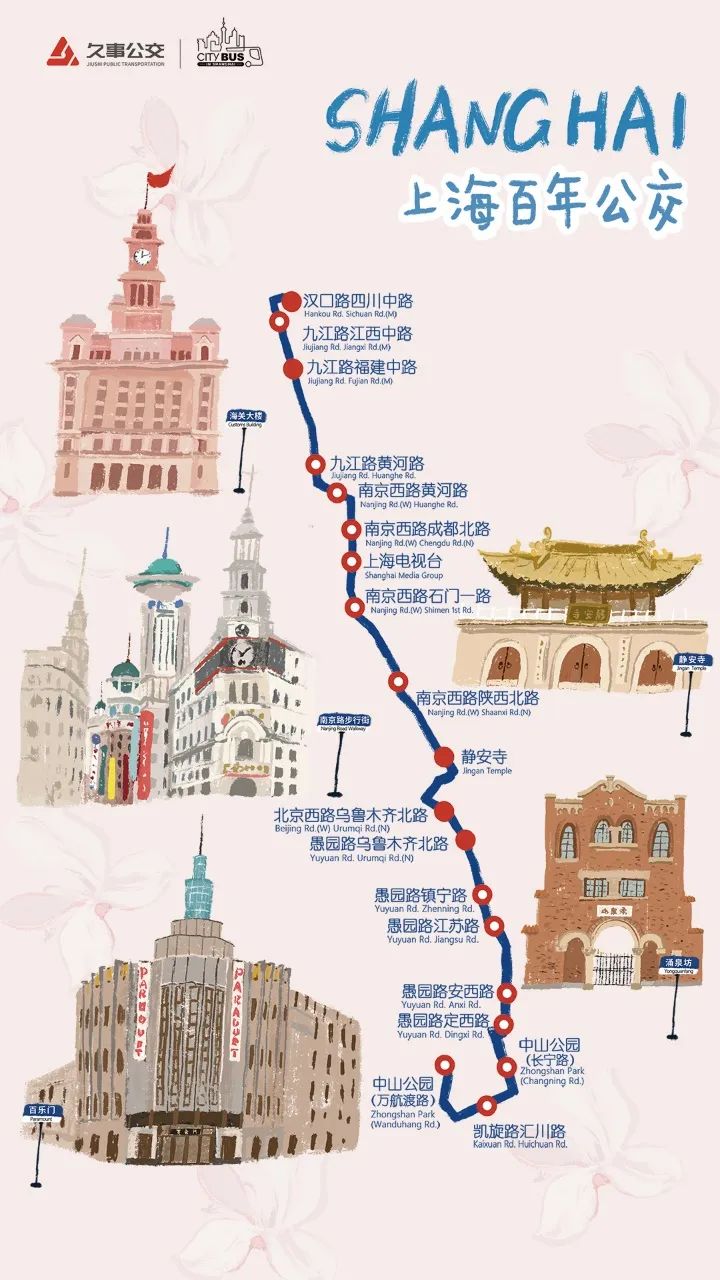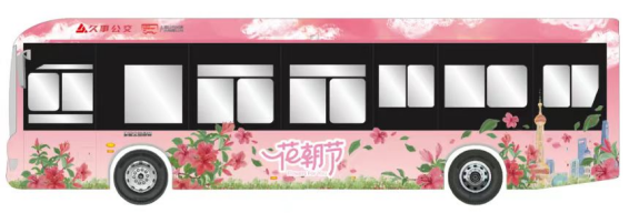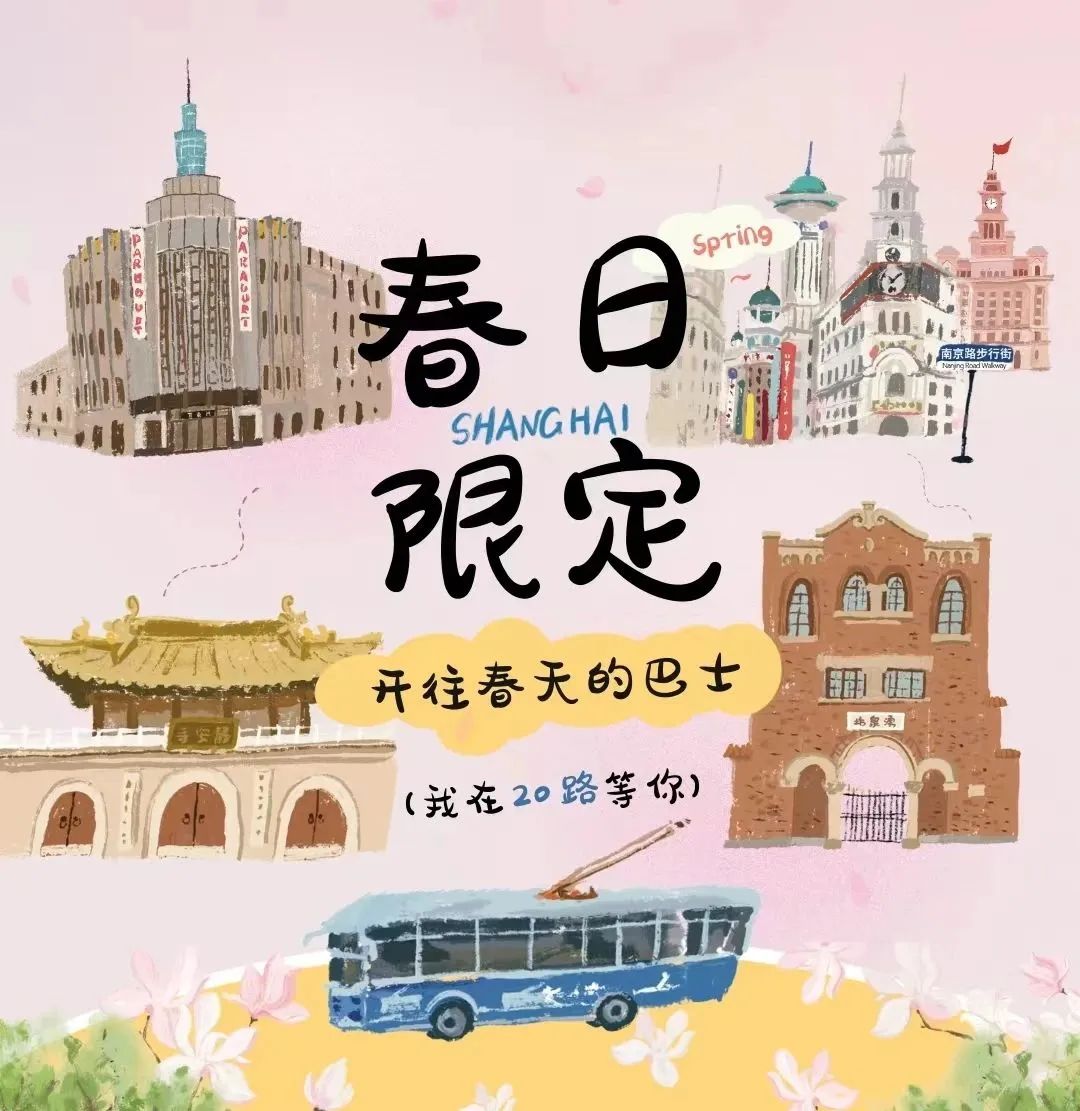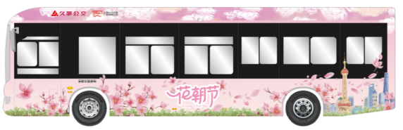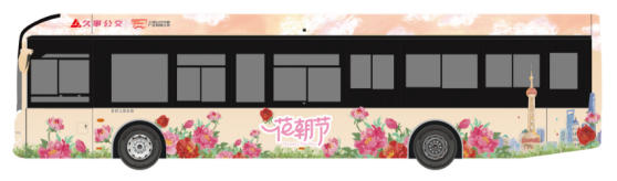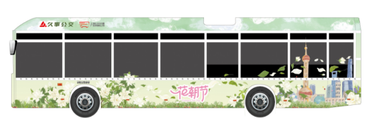 本次花朝节巴士主题活动以传统文化为媒、公交广告为引,旨在弘扬传统文化,引导公众低碳出行,丰富市民群众的精神生活,共推出5条线路共计6辆不同花卉主题的花车巴士。以拥有百年历史的20路公交车为例,独立插画师MIAO结合外滩海关大楼、南京路步行街、静安寺百乐门、涌泉坊等20路沿线标志性建筑进行原创设计,为20路公交打造春季限定车身涂装,让百年巴士青春再现。