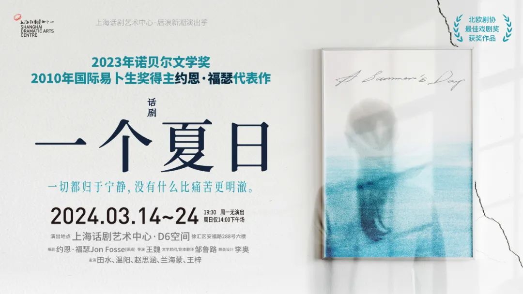 3月14日至24日,上海话剧艺术中心·后浪新潮演出季剧目,北欧剧协最佳戏剧奖获奖作品,诺贝尔文学奖、国际易卜生奖双料得主,挪威作家约恩·福瑟代表作《一个夏日》在上海话剧艺术中心·D6空间首演。