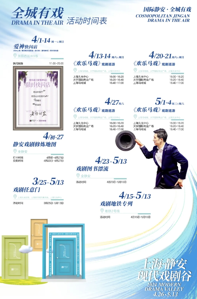 此外,今年现代戏剧谷首次将文化IP植入静安重要商业地标,探索文化流量向市场消费转化新模式。4月1日,音乐剧《爱情神话》张园特别快闪店将正式开放。4月13日至5月4日,“欢乐马戏”将推出“上海马戏城-上海久光中心—大宁国际商业广场”巡游线路,深化“ERA文旅IP”与大宁片区商圈合作。