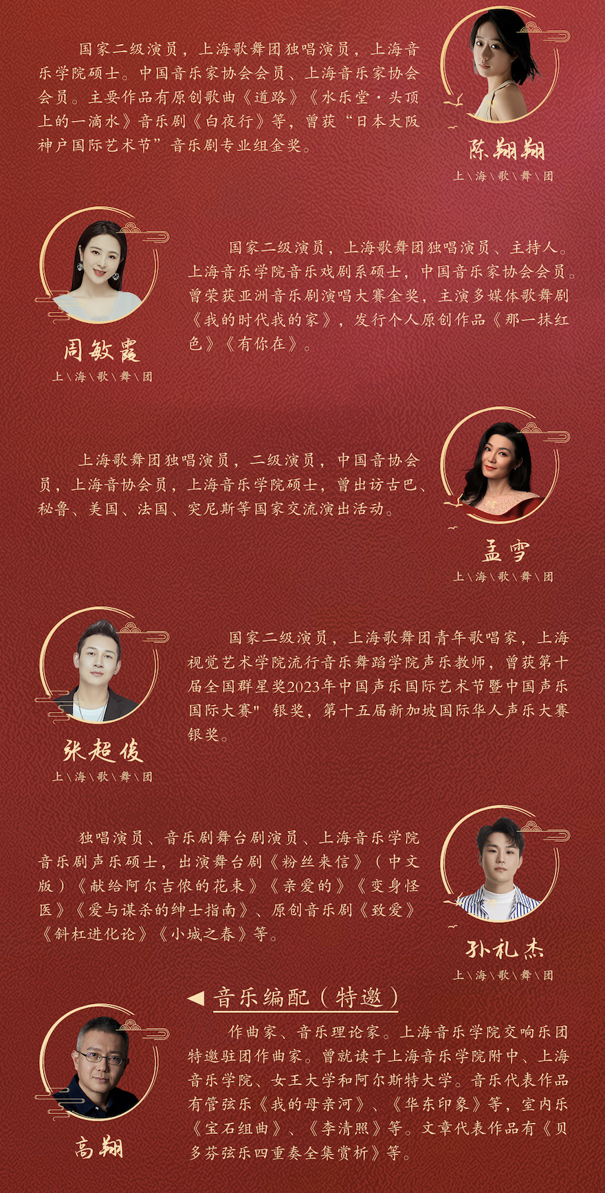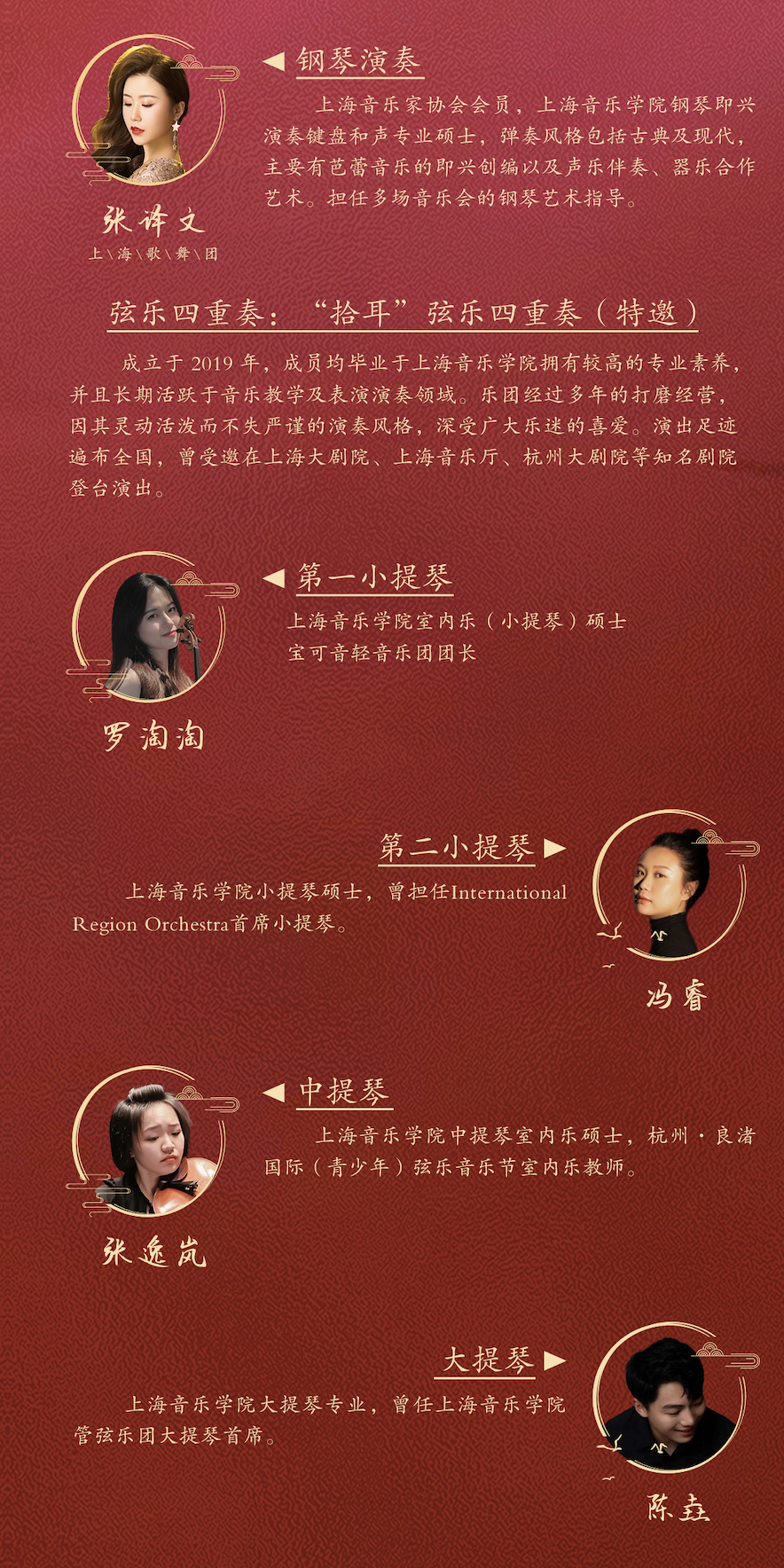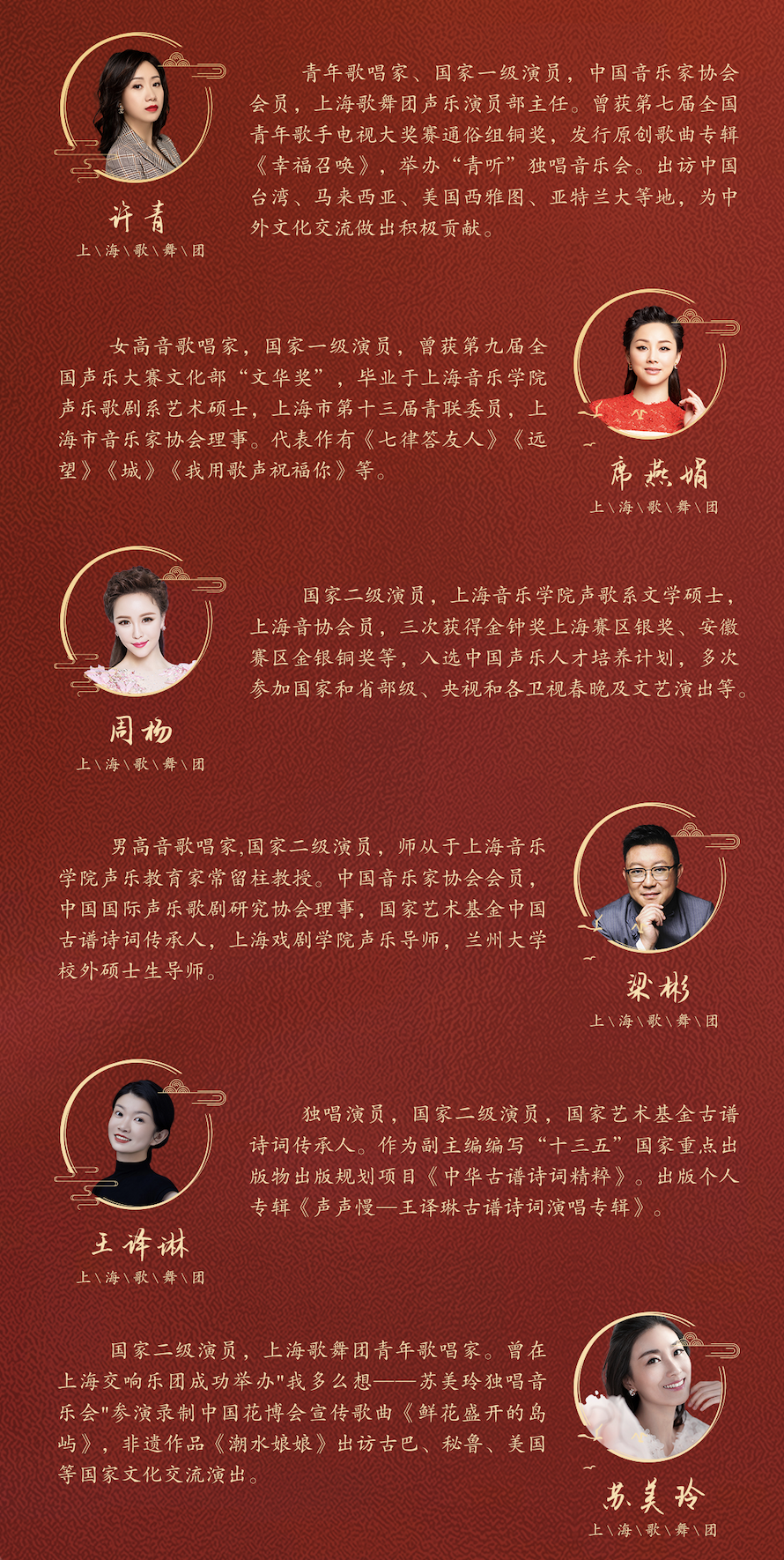 来自上海歌舞团的11位优秀青年声乐演员采用阿卡贝拉、多声部混声合唱、独唱等形式,配以钢琴与弦乐四重奏的全新演绎,将江南韵味的声调与海派室内乐完美结合,为优秀中华传统文化的美学精髓赋予现代审美内涵。
