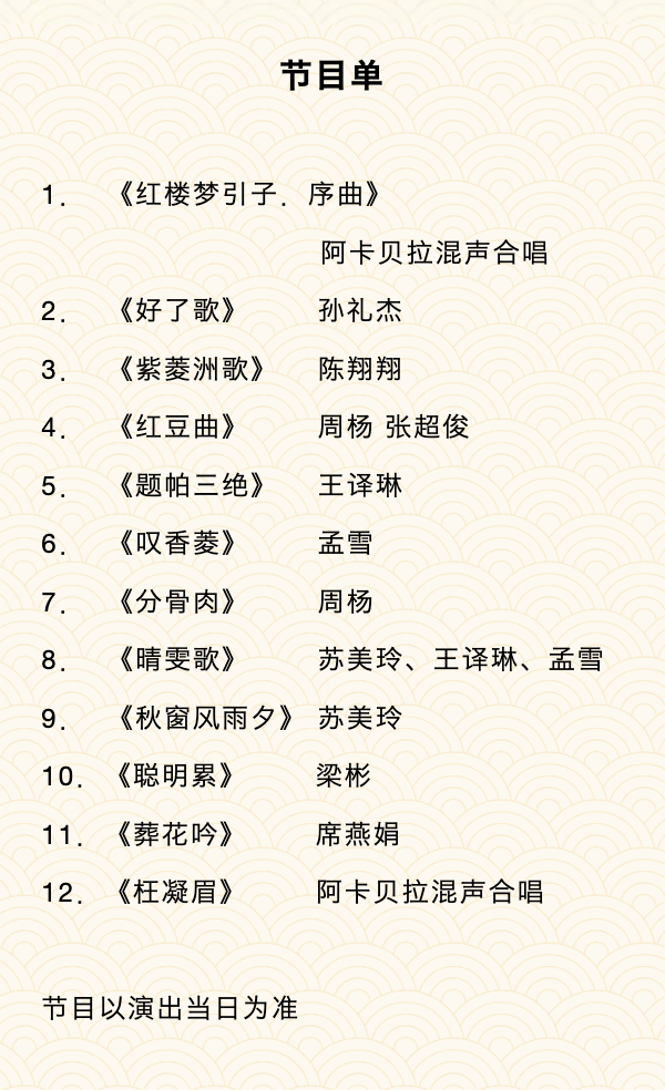 作为第39届上海之春国际音乐节的主体演出项目,《海上声韵--海派红楼梦主题音乐会》由上海歌舞团倾情打造出品。本次音乐会选择了13首87版《红楼梦》中的经典曲目,对其重新编配并融入上海特色的海派审美。