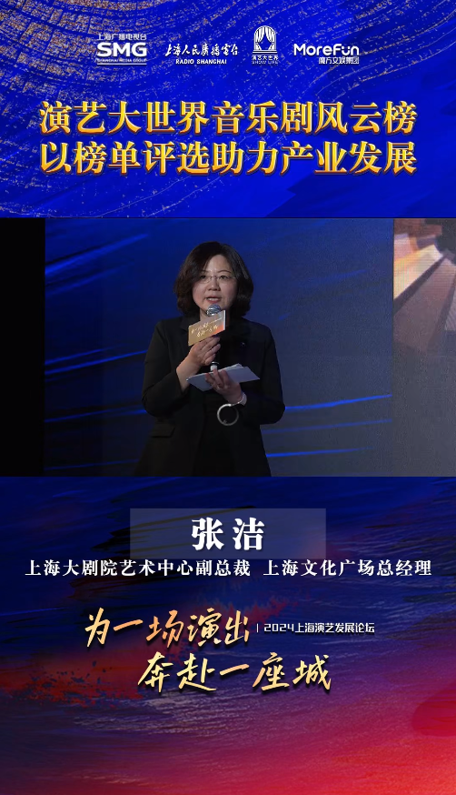 上海大剧院艺术中心副总裁、上海文化广场总经理张洁表示,上海已成为国内演出最具活力、体量最大、产业进程最快的城市。2023年,全国演出的9960场音乐剧中,有5888场在上海。上海的演出则有82.93%集中在演艺大世界。以演艺大世界为核心的上海音乐剧市场已成为吸引全国音乐剧爱好者的重要磁极。近四年,音乐剧人均票房贡献连年攀升,2023年达到2224元,人均观演频次达到4.24场。同时,演艺市场的热情正蔓延到多维度消费场景中,彰显“溢出效应”。