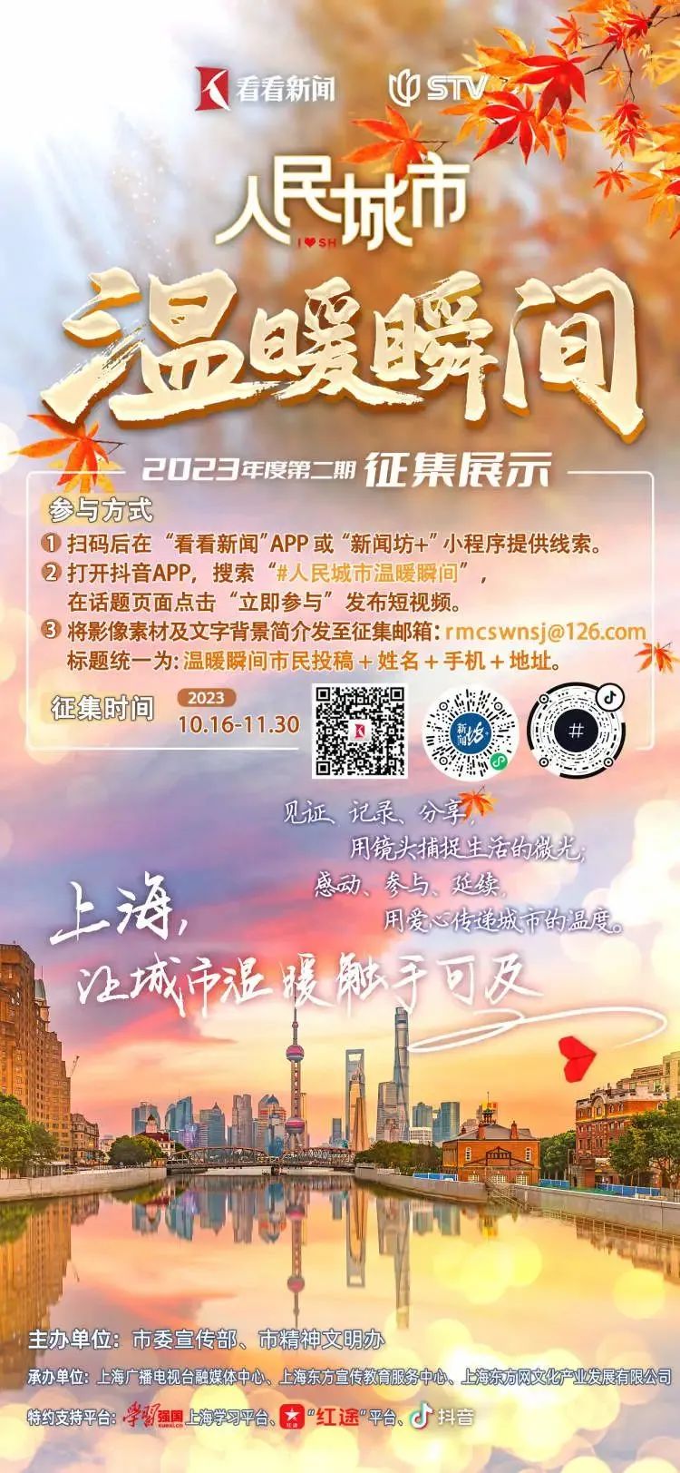 为深入学习贯彻习近平文化思想,广泛践行社会主义核心价值观,上海市委宣传部、市精神文明办会同上海广播电视台融媒体中心等单位,举办了2023年“人民城市 温暖瞬间”征集展示活动,汇聚一年来发生在市民百姓身边的好人好事、凡人善举、温暖瞬间,讲述温暖人心的故事,再现感动人心的场景,传递鼓舞人心的力量。活动分为两期举办。