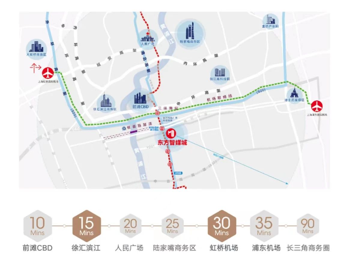项目总占地面积400亩,规划总建筑面积约100万方,地理位置优越,地铁8号线浦江镇站直达,毗邻前滩,位于南北高架延伸段,周边拥有畅达的外部交通环境和成熟的公租房、商教、医疗、休闲配套。项目共分四期开发,一期项目将于今年9月竣工交付。