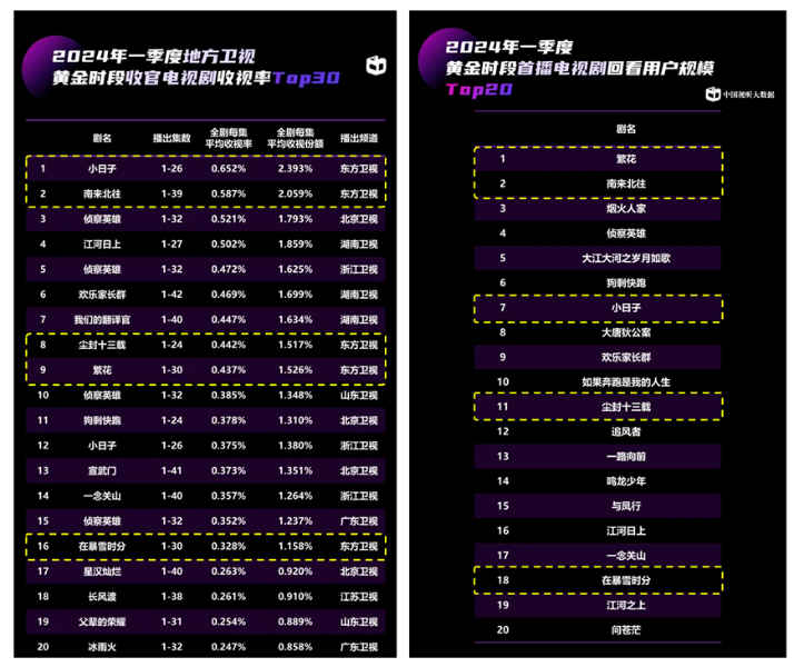 其中,东方卫视一季度播出的都市现实题材剧《小日子》以平均收视0.652%、平均收视份额2.393%位居省级卫视黄金剧场季度收视第一,东方卫视《南来北往》以平均收视份额2.059%位居次席,成为此次季报中省级卫视仅有的两部份额破2%的电视剧。此外,东方卫视一季度播出收官的5部大剧全部进入季度前20名榜单,从数量、质量到品质实现了全方位领先。