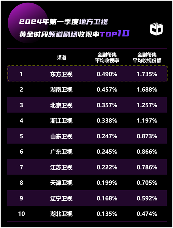 根据CVB一季度收视季报显示,东方剧场充分发挥“定盘星”作用,以平均收视0.490%继续领跑省级卫视黄金剧场。自有CVB统计以来,东方剧场收视冠军位置无一旁落。