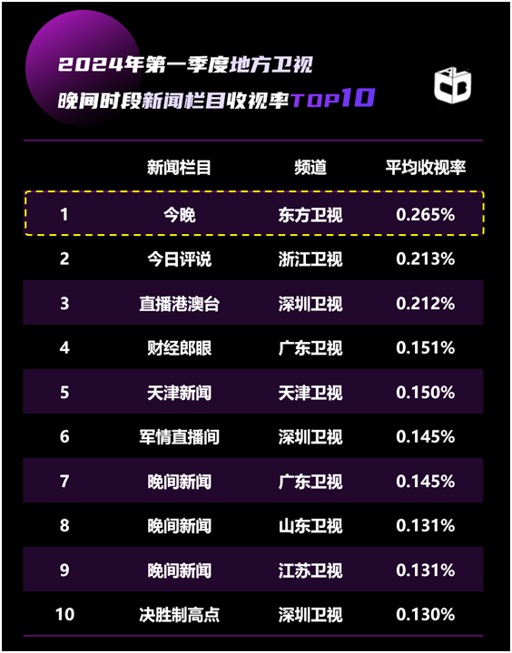 根据CVB数据显示,在一季度卫视新闻栏目中,东方卫视多条新闻线保持领先优势,其中《今晚》继续保持省级卫视晚间黄金档收视第一,《看东方》《环球交叉点》排名早间时段收视前二,《午间30分》排名午间时段收视前二,《东方新闻》排名傍晚时段新闻收视前二。