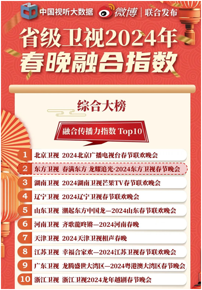 CVB今年3月发布的2024年“卫视春晚融合指数”和“卫视元宵晚会融合指数”显示,东方卫视《春满东方 龙耀追光·2024东方卫视春节晚会》排名卫视春晚第二,东方卫视与抖音合作的《2024超有料元宵夜》排名卫视元宵晚会第二。今年的东方卫视春晚还刷新了自CVB记录以来自身最高收视纪录。