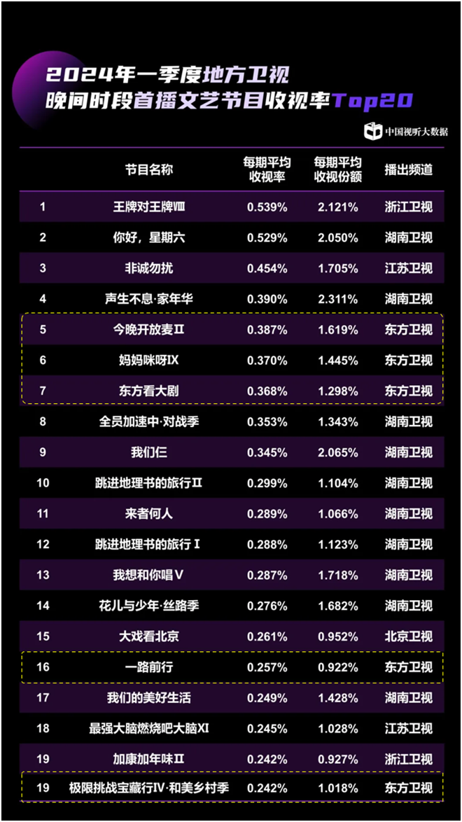 根据CVB一季度收视季报显示,在省级卫视首播文艺节目收视前20排行榜中,东方卫视共有5档节目入围,入围数量排名第二。其中,《今晚开放麦Ⅱ》《妈妈咪呀Ⅸ》《东方看大剧》3档节目都进入一季度收视前10位。